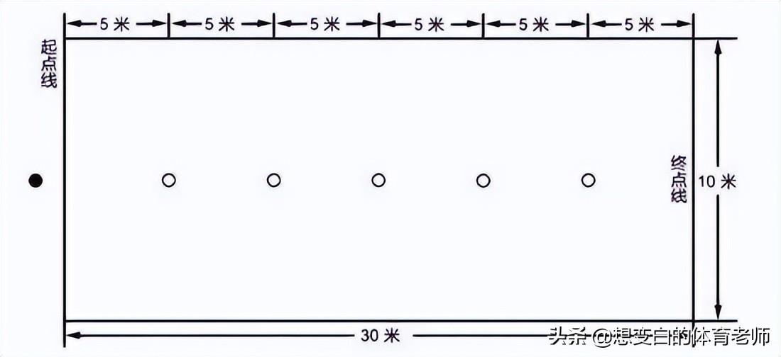 足球绕杆总长为30米,从起点至终点各5米间隔
