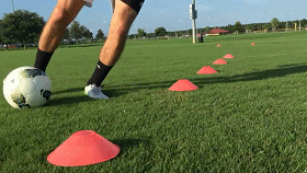 不多说,就是直线过障碍物。但在训练时,队员一定要根据自己的优势和弱点更有针对性:强化脚内侧或外侧,非惯用脚盘带等等。