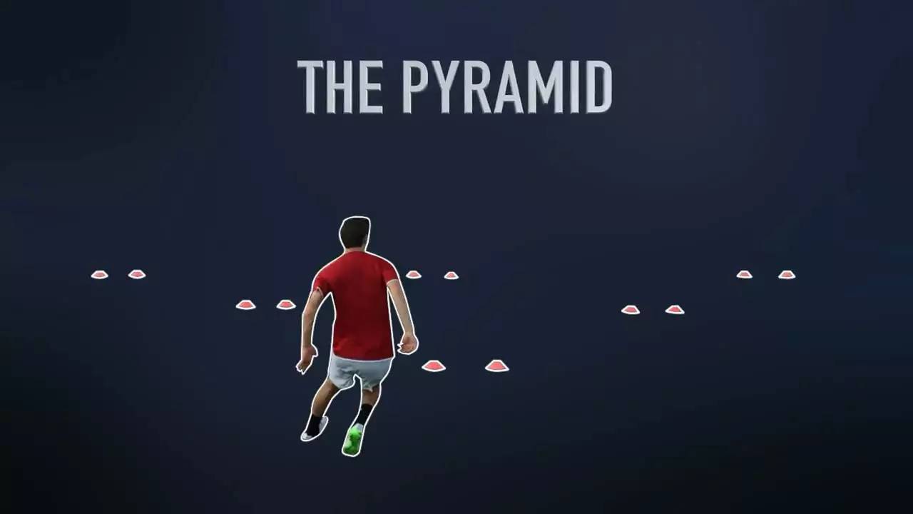 训练时队员每一次选择左中右任意一条路线通过,较之基础训练,金字塔训练法能强化球员的斜线盘带能力。