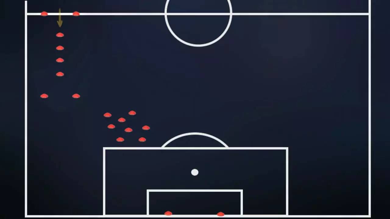 这种训练方法主要目的是:一来使球员更能适应长距离高强度的带球,尤其是边锋球员。二来随机密集摆放的障碍物能够训练带球者在面对多名防守球员时应变的能力。