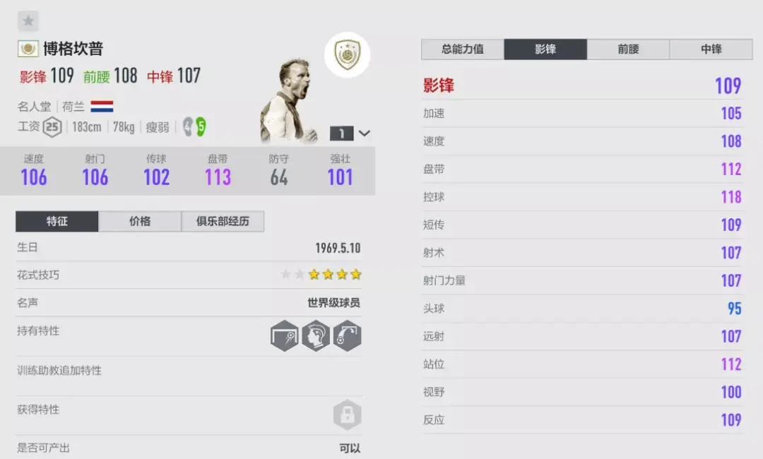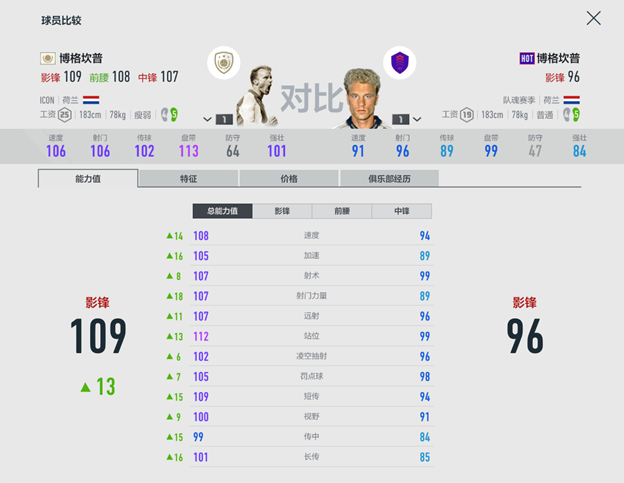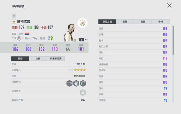 而ICON博格坎普相较于队魂赛季来说有了质的飞升,逆足上都是45脚,皆有“花式大师”、“善于搓射”这两项实用的特性 ,其余属性则大幅度提升,虽然模型从普通变成了瘦弱,但强壮值来到了101(涨幅17),平衡值来到了111(涨幅13),体力也上涨到了106(涨幅20),无形中增加了与对方强壮后卫正面对抗的容错率 。