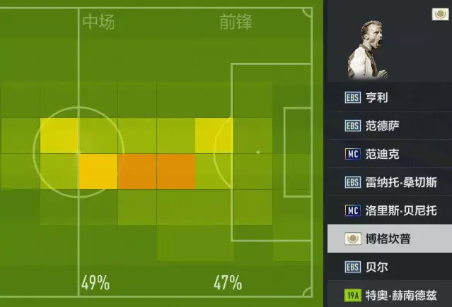 特性方面,“善于搓射”和“花式大师”实用性都比较高,能够一定程度上提升球员上限 。ICON博格坎普的参与度为攻3守2,在当前版本,这是很适合前场球员的配比。既能够积极参与进攻,又可以投入到中前场的逼抢和拦截 ,玩家不妨赋予博格坎普适当的防守任务,以提升防守的层次性。