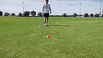 在实战中这不是一个简单的技能,但是真的非常酷,我们练习30秒,逐渐找到通过脚踝的摆动让球越过标志盘。
