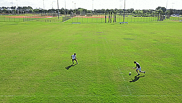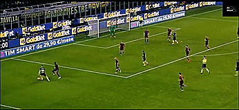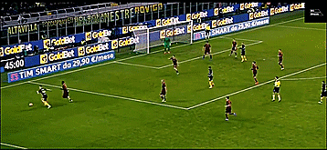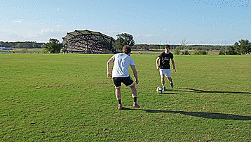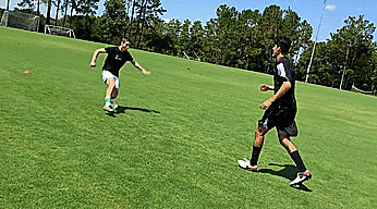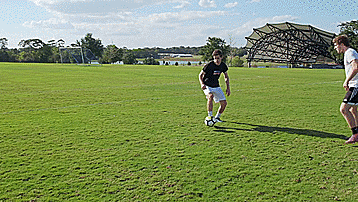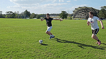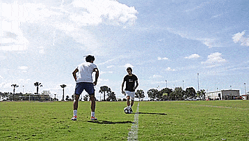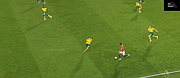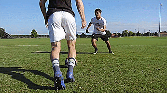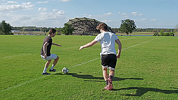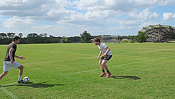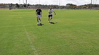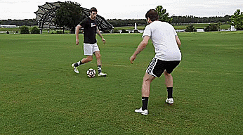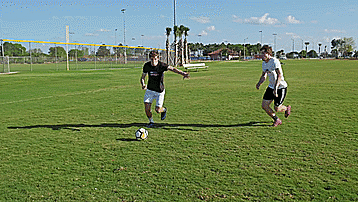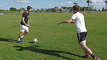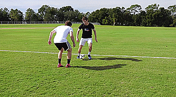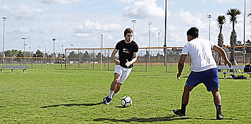 如果防守队员上前封堵传中线路,我们用脚内侧切球将球从腿后变向。