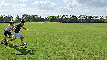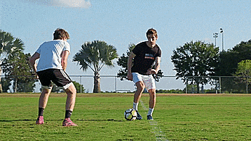 我们用脚底快速将球拉回来,然后用脚内侧推球从防守队员支撑脚侧摆脱防守队员。