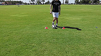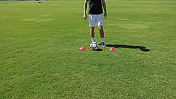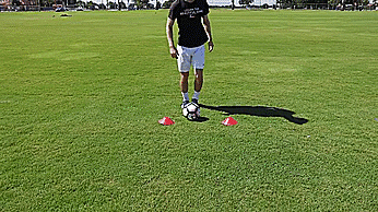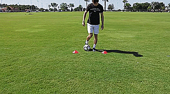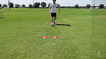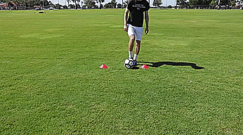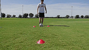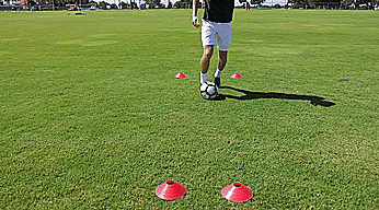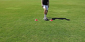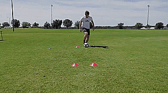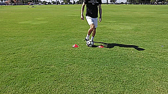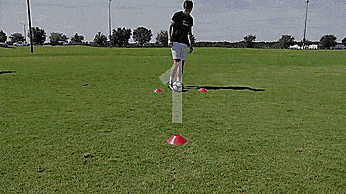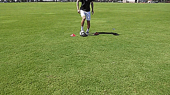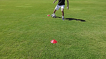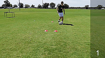 当带球朝向标志盘的时候,我们先迈一步看上去要向一个方向加速,然后用我们脚的脚外侧推球越过标志盘。
