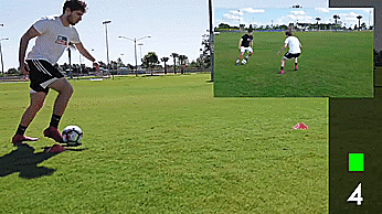 我们带球到标志盘一侧,然后用脚底将球拉回,最后用脚内侧推球突破标志盘。