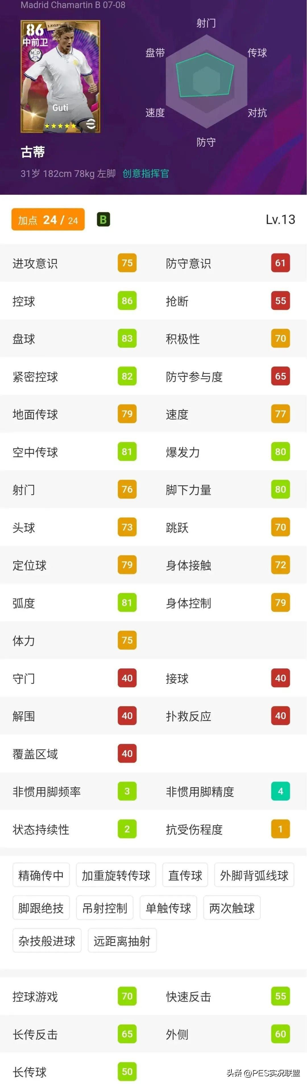 球员简析:古蒂客串前腰的评分比注册位置更高,而且在新赛季,他的关键属性分布已经无比接近克鲁伊夫和卡卡。如果新赛季取消技能道具,自带单触传球和两次触球的古蒂无疑会成为前腰位置的版本新宠。