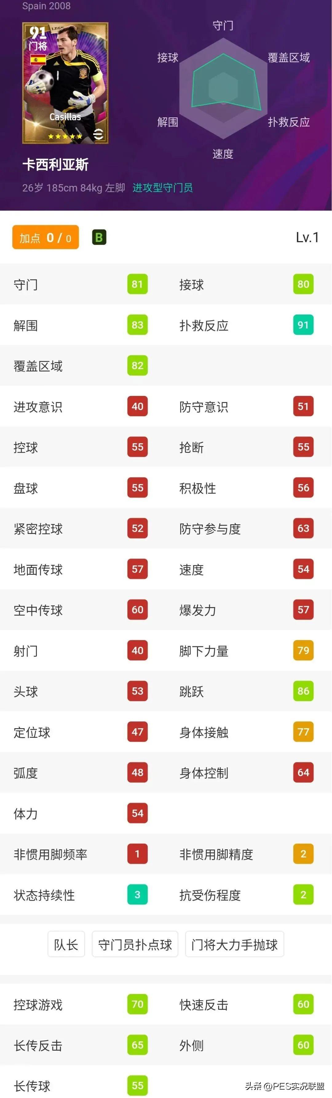 球员简析:卡西利亚斯是新赛季初始评分最高的门将,同时也是数据库中唯一一个进攻型传奇门将。