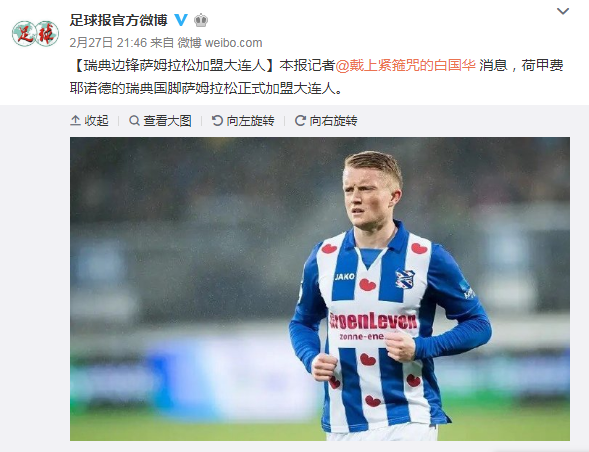 除了中后卫,大连人还补强了锋线,他们签下了另一位瑞典国脚萨姆-拉松。这位球员目前在费耶诺德踢球,司职边锋,本赛季出场21次,打进4球助攻1次。据悉,拉松的转会费为500万欧元,大连人与他签订一份为期三年的合同。拉松的到来可以弥补卡拉斯科离队的空缺。
