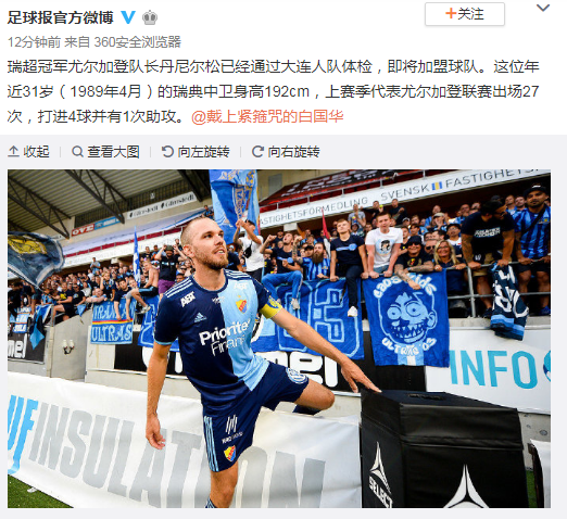 来自《足球报》的消息,瑞典国脚丹尼尔松加盟中超球会大连人在即,他已经通过了俱乐部安排的体检。丹尼尔松1989年4月8日出生,即将年满31岁,司职中后卫,曾在瓦斯特拉斯和松兹瓦尔等球队踢球,2018年冬窗,他加盟尤尔加登,至今出场58次,打进6球,其中上赛季出场29次,打进4球。