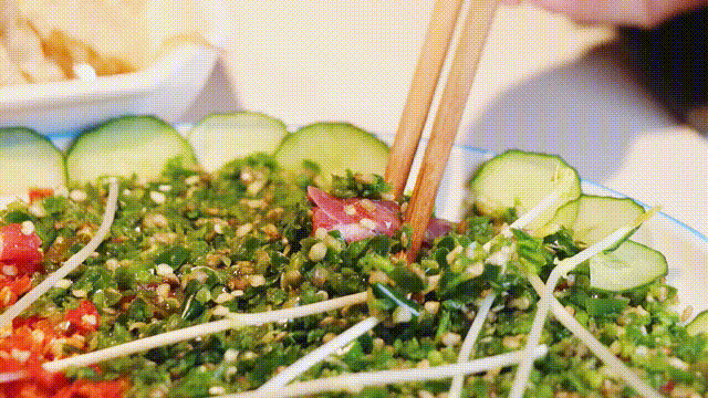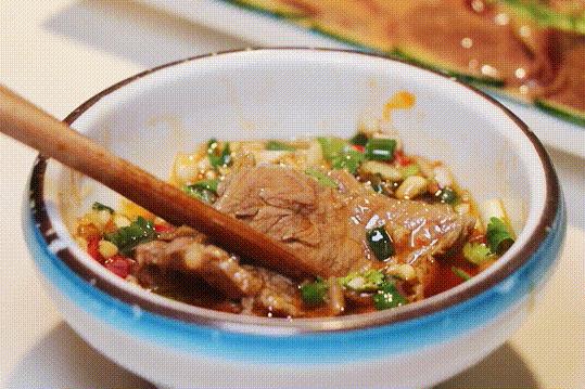 把牛肝放入油碟里滚上一圈,瞬间裹满了油汁、葱花、芝麻,大口下肚、超过瘾!