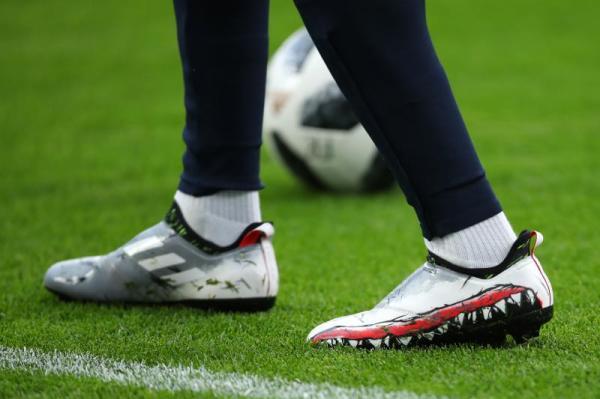 瑞士队的扎卡在世界杯前的一场热身赛上,就在对手的一次犯规时,球鞋鞋面被踩破。