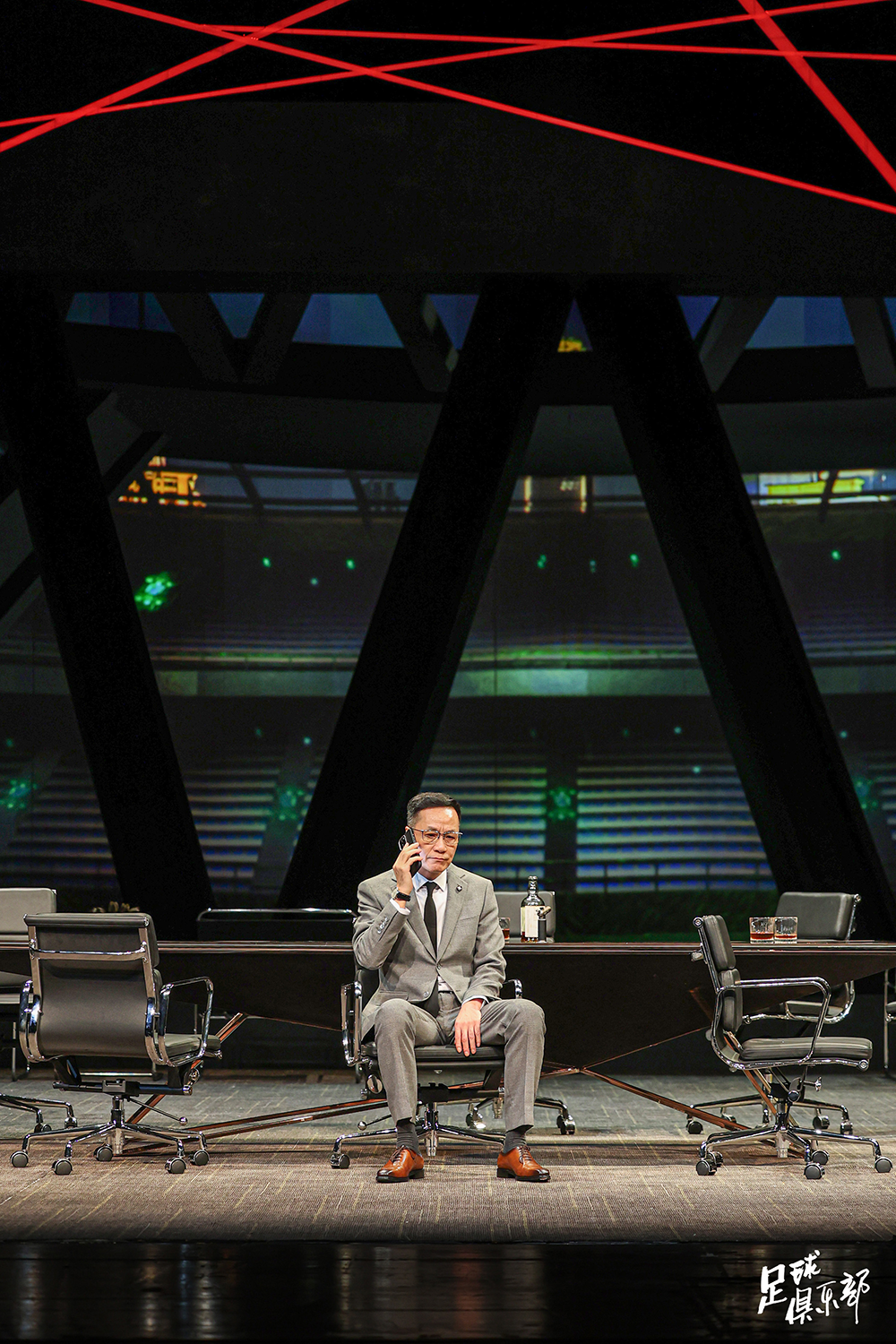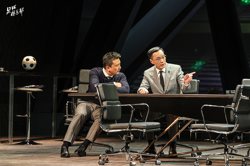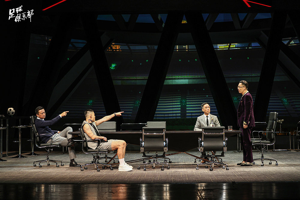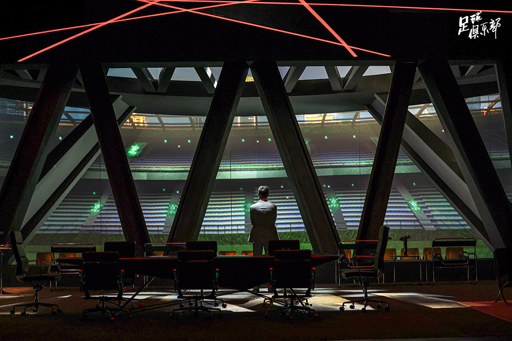 而从小剧场升格为大剧场演出,舞台布景也做了全面升级。全新钢架结构搭建起的会议室,令人不难联想到去年才重张开业的北京新工人体育场的样貌。就此,徐昂认为这部戏的故事背景以足球场作为景深呈现最合适不过。“之前的版本是在小剧场演的,舞台对着三面观众席,‘会议室’完全是封闭的。这次如果会议室的桌子还是竖着摆的话,有些演员的表演会被遮挡掉,所以我们把桌子横着放,同时这样的摆放形制也同后面大飘窗外的绿茵场形成了一种互文的对照关系。如果观众注意看的话,代表足球专业的角色一般都在“画左”(桌子左侧)活动,而足球经营的角色则在“画右”(桌子右侧)。”