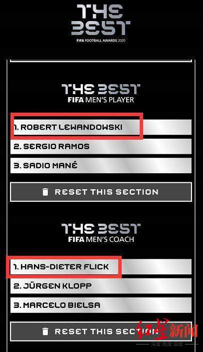 马德兴告诉红星新闻记者,他在世界足球先生的投票顺序为:莱万、拉莫斯、马内;最佳教练按顺序则为:弗里克、克洛普、贝尔萨。马德兴原本预计弗里克当选最佳教练应该没什么争议,毕竟上赛季弗里克带领拜仁拿到五冠王(德甲冠军、德国杯冠军、德国超级杯冠军、欧冠冠军、欧洲超级杯冠军),欧冠更是8比2横扫巴萨成为永恒的经典。“统计数据显示,弗里克上任后36场各项比赛的胜率达到惊人的91.6%!如此效率,还有什么理由选择他人?”马德兴说。