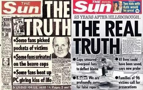 需要指出的是,比惨案本身更让利物浦球迷感到严重伤害的,是之后英国著名小报《太阳报》刊登的一篇题为“真相”(The Truth)的报道,报道中宣称是利物浦球迷“醉酒闹事”“打骂警察”“撞开铁闸”导致的惨案,并对当地警方的明显失职极力开脱。这样不负责任的报道对KOP们而言可谓是“二次伤害”,随后他们展开了长达23年的运动,向警方、向政府、向司法机关追寻真相,严惩失职警官,并还这96名罹难球迷一个清白,这就是其中一条著名标语“Justice for the 96”(为了96名逝者的正义)的由来。