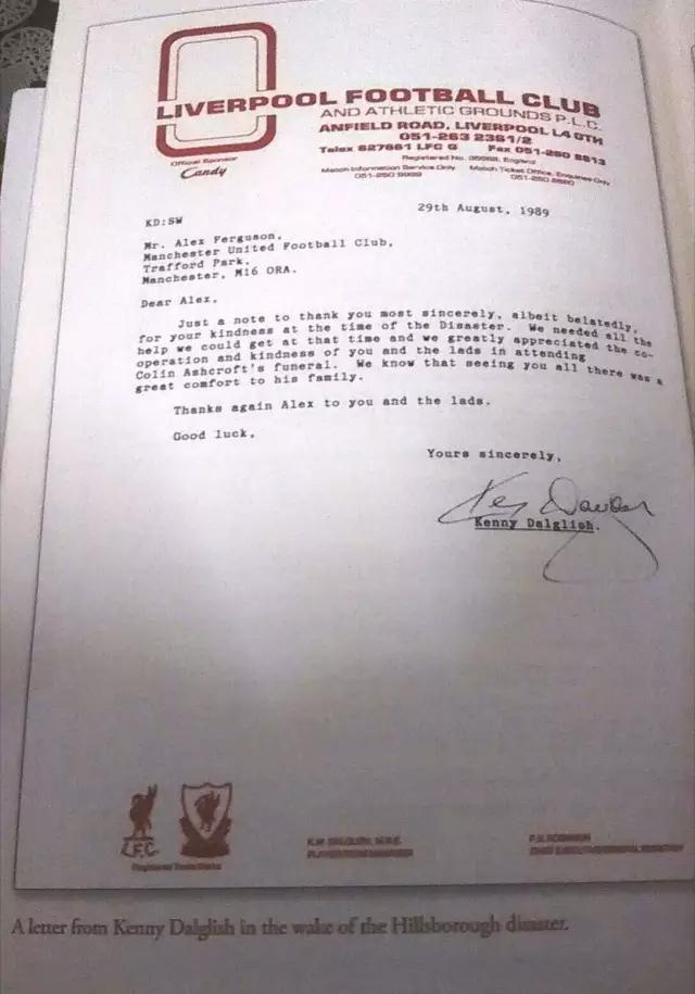 而曼联方面除了发布官方海报纪念外,主教练弗格森爵士和俱乐部传奇查尔顿爵士也出席了其中一年的纪念仪式并敬献花圈。据利物浦名宿达格利什透露,在当初惨案发生之后,弗格森就亲自致电慰问并表示愿意提供帮助,此后达格利什为表感谢以俱乐部官方名义发送了一封亲笔签名的信函,这封信函被收录在弗爵爷退休后阐述自己执教和管理经验的著作《Leading》(直译:领导力)中。