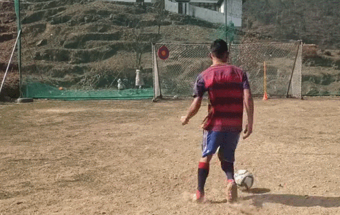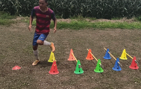 村里只有拉马一个人踢球,他找不到人陪练,就自己对着木板练习传球。没有专业教练,他就从网上找视频,自己给自己制定训练计划。但大多数时候,拉马只能练习射门、盘带和颠球。缺少训练器材,他就地取材,用废弃的轮胎当障碍物;把木头绑在一起充当“人墙”;有些器材找不到替代品,他就自掏腰包,从网上订购。