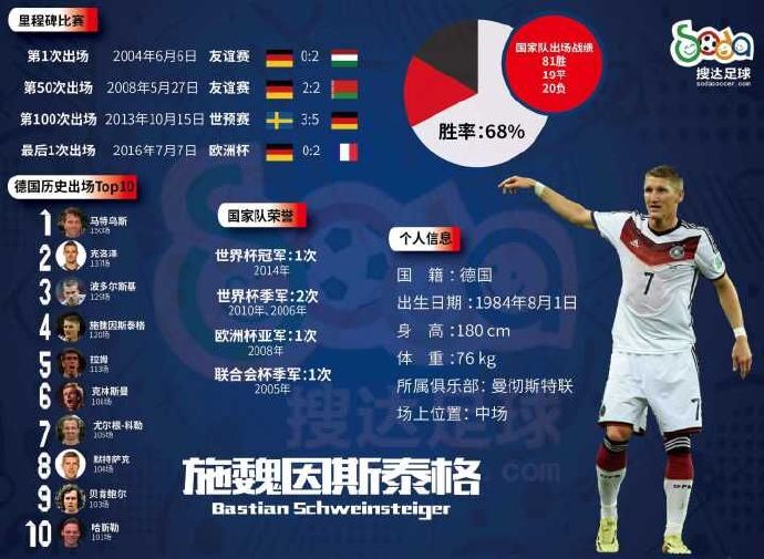 施魏因斯泰格今日宣布退出德国国家队。从2004年首次代表国家队出战,120场比赛足以把施魏因斯泰格写进德国足球的历史,通过下图更加详细了解施魏因斯泰格的。