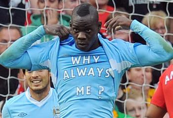 1比6!曼城血洗曼联。2011年英超曼联主场对曼城的打出罕见比分,第22分钟,巴洛特利展现雷人神功,他不跑也不庆祝,站在原地面无表情地慢慢撩起球衣,球衣上写着WHY ALWAYS ME!霸气十足!自此巴洛特利被戏称巴神,巴神的世界你永远不懂。