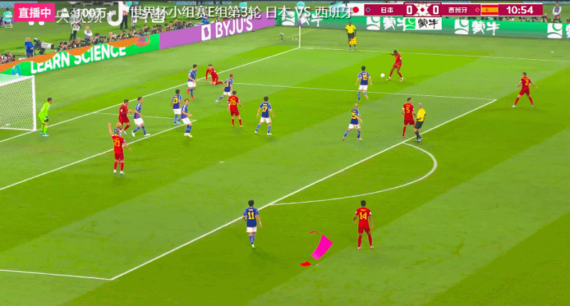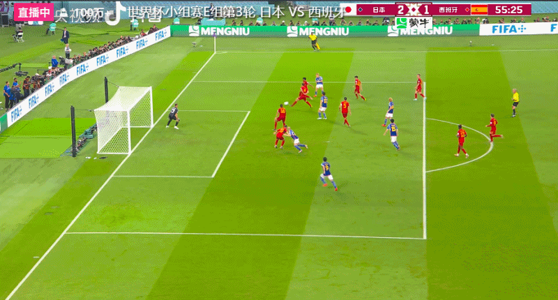 第51分钟,堂安律在禁区右侧低传门前,后点的队友在皮球即将出底线之前将球勾回,田中碧抢在罗德里之前头球顶空门得手。VAR介入后认定进球有效,日本队2-1反超了西班牙队!日本队在142秒内连进两球反超。