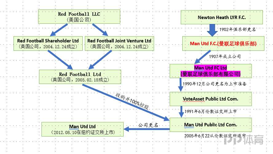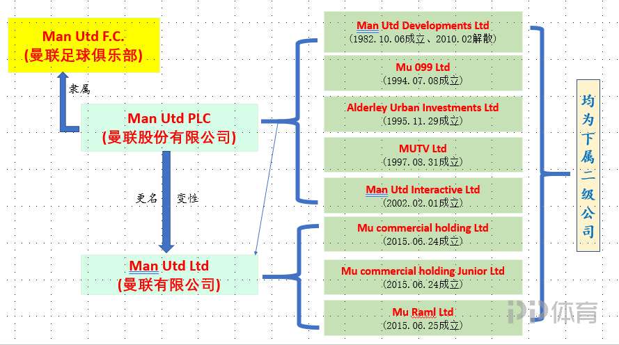 第一张图是曼联足球俱乐部成立公司之后的演变图,即如何从一个股份有限公司变成的有限公司,又如何完成在伦敦证交所上市、退市,最终又在纽约证交所上市。但这并不是本文的重点,重点还是在第二张图,即曼联足球俱乐部有限公司下属的各种二级公司,图中的二级公司还只是部分。
