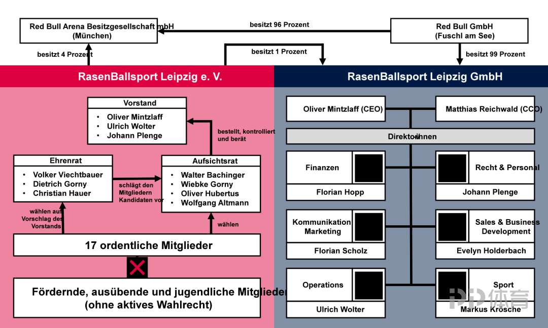 在升级过程中,值得一提的是,“RasenBallsport Leipzig e.V。(莱比锡草地球类运动注册协会)”俱乐部在2014年因升入德乙,按德国职业联盟的相关规定必须公司化,所以注册成立了“RasenBallsport Leipzig GmbH(莱比锡草地球类有限责任公司)”。其中,1%的股份归俱乐部,红牛公司则占99%的股份。从“e.V。(德语eingetragener Verein的缩写,意为注册协会)”到“GmbH(德语Gesellschaft mit beschrankter Haftung的缩写,意为有限责任公司)”,从社团性质到公司性质,在概念上已有本质差异。