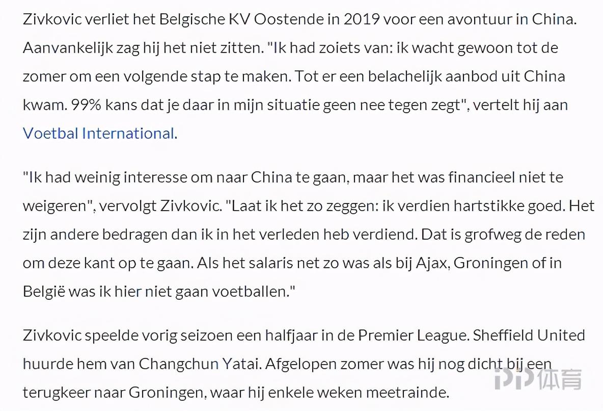 近日,在接受荷兰媒体“Voetbal Primeur”采访时,亚泰外援日夫科维奇直言自己来到中国踢球就是为了钱。