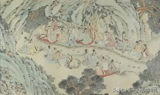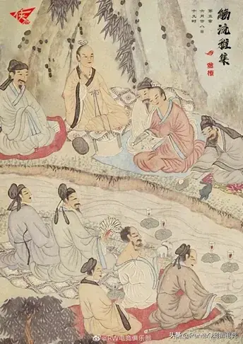 “流觞雅集”的典故来源大家都很熟悉,高中语文必修文言文王羲之的《兰亭集序》里提到的“此地有崇山峻岭,茂林修竹,又有清流激湍,映带左右,引以为流觞曲水,列坐其次。”描述的就是”曲水流觞“这一高雅活动的情景,参加活动的人沿着溪水依次席地而坐,装有酒的器皿乘着溪水由上流往下游行进,酒在谁前面停留谁就要作诗或者饮酒。
