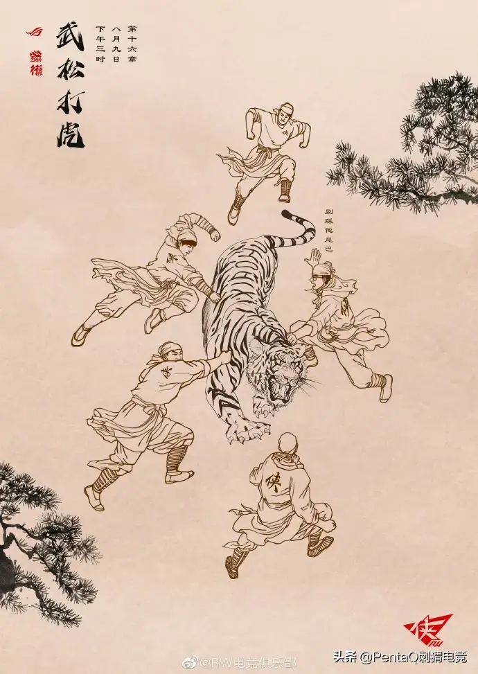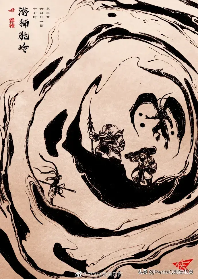 这一张该报采用的是线描绘画的形式,构图饱满,运线描绘了丰富的水纹,机智的设计师把TES队员的ID暗藏在其中,“大禹治水”的明示RW(大禹)要治理新加入TES的JackeyLove(阿水),中间的小块陆地上设计了一颗球,暗喻TES的替补辅助选手Qiuqiu,也由此埋下了天秀操作的伏笔。