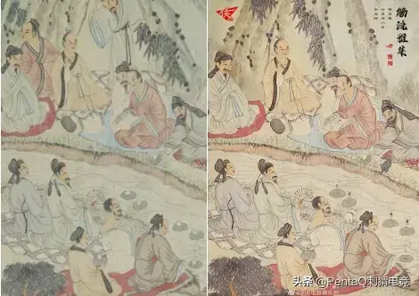 海报的原图为明代画家尤求的《兰亭雅集图》,截选画作的局部进行修改。包括路人消除,让两边人数五五开;对小细节进行修改,把装酒的器皿换成高脚杯、卷轴变召唤师峡谷地图,符合要创意表达;画面对比度、色调调整,看起来更清晰更舒服。