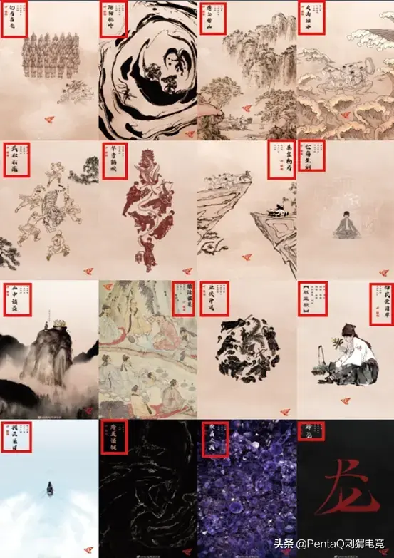 首先,全部采用竖向构图,符合手机看图的用户习惯;第二,排版布局大致上统一,图中以红色框框出的字体是主要文案,字体为竖向排列,置于左上角,根据画面的具体情况偶尔挪动到右上角,队标普遍置于下方,充当水印,做出品标记,并不抢海报主要内容的风头;第三字体的使用和格式固定;第四,16张海报里,其中12张采用宣纸材质的背景,色调氛围统一了,后面4张虽然色调和海报内容差异非常大,但前面的种种形式上的统一沿用下来,倒也不违和。