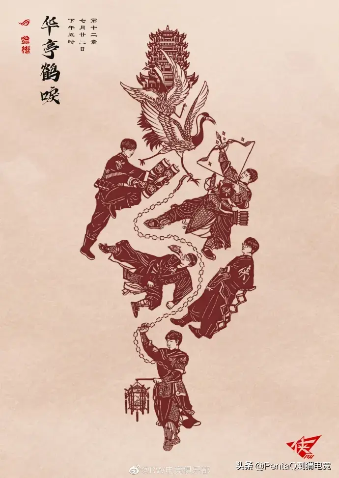 RW vs ES和RW vs FPX这两张海报的整体效果都拥有类似剪纸和木刻版画的气质,中国传统美术的气息极浓。角色有着门神贴画的造型,却是更趋近剪纸的形式。