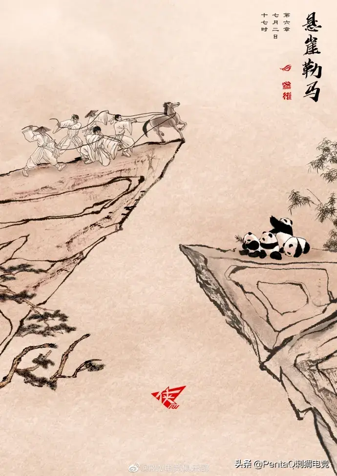 RW设计师的聪明机智和反应迅速,灵性操作把“大禹治水”去掉滔天的水纹,主题改成了”大禹蹴鞠“。(注:蹴鞠,古代的足球)从治水到踢球,RW夏季赛海报开局暴击,着实吸粉。本来临时更换选手这种情况,RW这边的设计师是可以选择装死不改海报,不过凭借思维的极速转换,创造了无可替代的公关案例,设计师值得加鸡腿。
