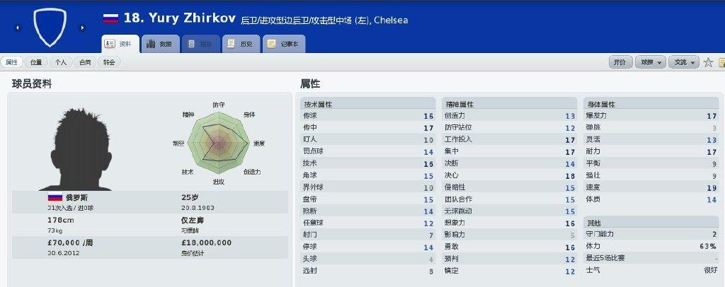技术特点:左路一条龙的存在,以FM10展示的属性图来看,加盟切尔西那一年的日尔科夫,作为攻击手,技术环节除了射门和远射外,传球、传中、技术、盘带等等几乎无可挑剔,还有数值16的可观想象力;作为后卫,工作投入、集中、耐力都达到17,加上14的抢断,纵然在防守技艺方面有所欠缺也能成为一个可靠的缠斗型后卫。