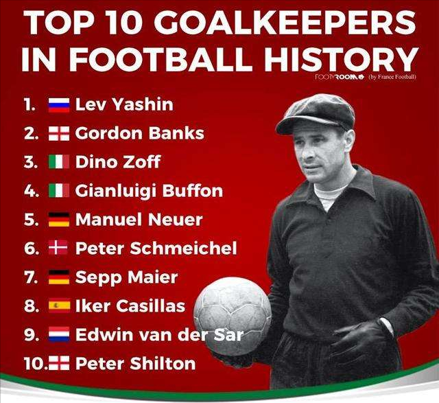 门将之神——雅辛,世界最佳守门员奖——金手套奖的前身就是“雅辛奖” 。他是世界上唯一获得过金球奖的门将,也是唯一当选欧洲足球先生的门将,1970年评选世界最佳球员排名仅次于贝利,2000年被国际足联评为世纪门将。球王贝利说:“要想攻破雅辛的大门,你需要付出成倍的努力。” 无论任何机构的官方排名中,守门员的第一位永远都是雅辛。