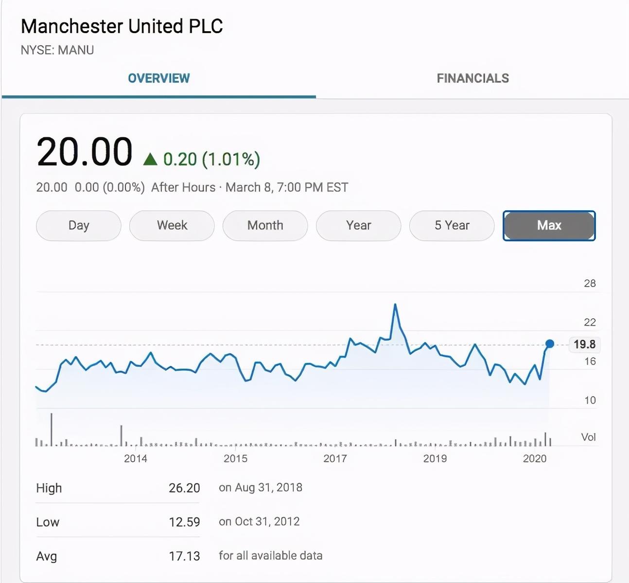2012 年,由于严重的债务压力,格雷泽家族拿出部分股份,让曼联再次在纽约证券交易所上市,多年来股价一直在 10~25 美元区间内徘徊,正如曼联俱乐部本身的表现,为了对股东负责、降低运营成本,曼联对大举出击购买优质球员总是犹犹豫豫,常被球迷诟病。