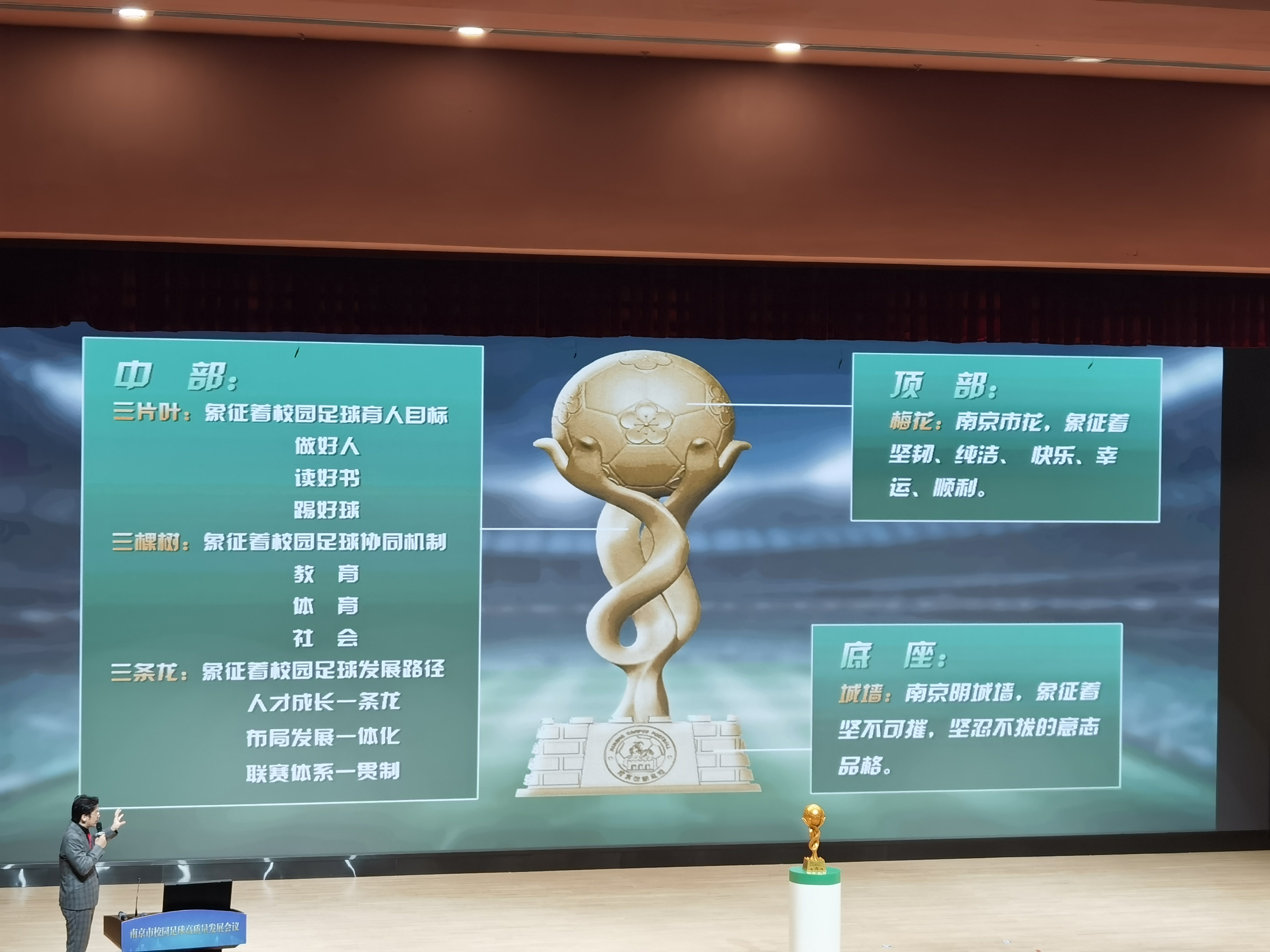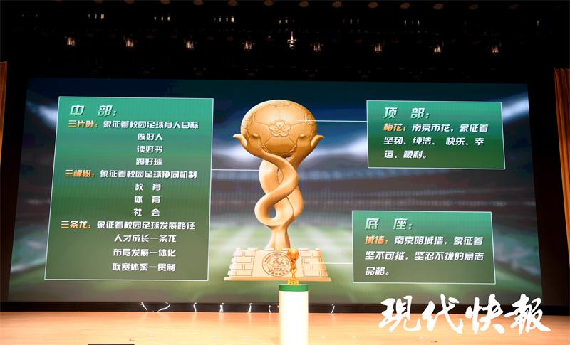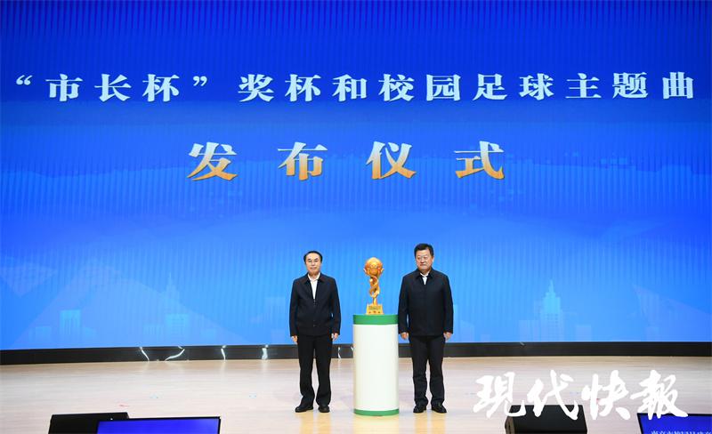 当天的会上,还发布了“市长杯”奖杯以及校园足球主题曲。“市长杯”奖杯底座为南京明城墙;中间部分代表着校园足球协同机制—教育、体育、社会,也寓意着校园足球育人目标—做好人、读好书、踢好球;最顶部为印有梅花的足球,梅花也是南京的市花。整个奖杯体现了南京元素和校园足球元素,寓意着用坚定的信念,三个点的支撑,托举起孩子的中国足球梦。