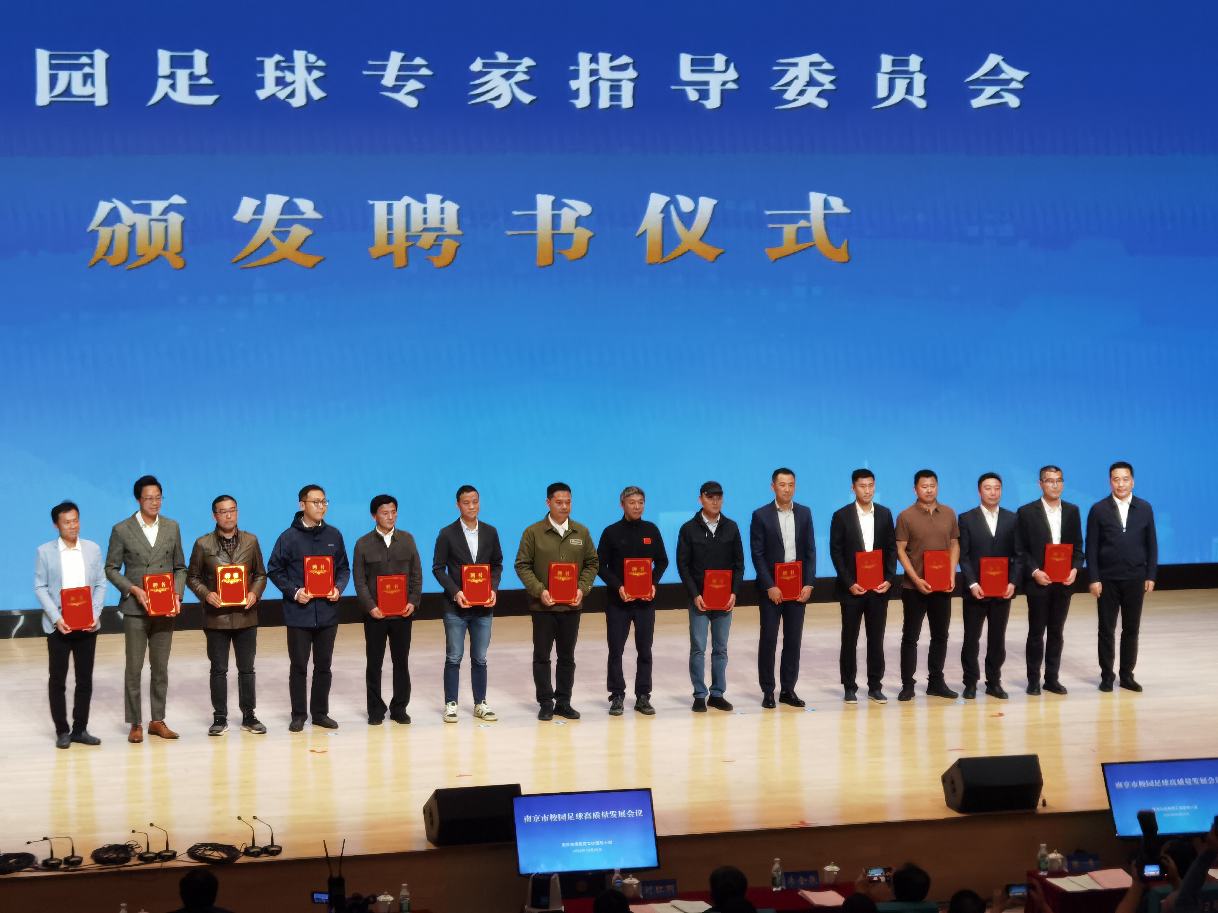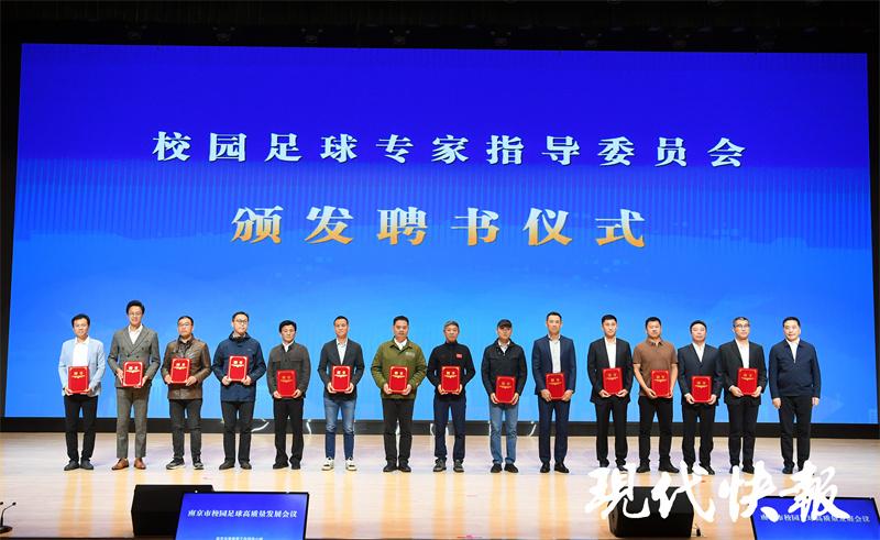 会上, “南京市校园足球教育发展中心”正式揭牌。南京将依托发展中心,打造“校园足球竞训数智平台”,为科学训练、人才选拔、伤病预防等提供精准数据分析,辅助教练更合理更科学地训练教学,让足球教学做到有“据”可依。14位大中小学专家代表上台领取了“南京市校园足球专家指导委员会成员”聘书。据悉,南京市校园足球专家指导委员会由来自全市高校、教研部门、大中小学的30名老师组成,他们将根据各自的专业领域,从教学、训练、科研等不同方面,充分发挥咨询、推动、培训、评估、示范、指导和服务作用,推动南京校园足球工作专业化。