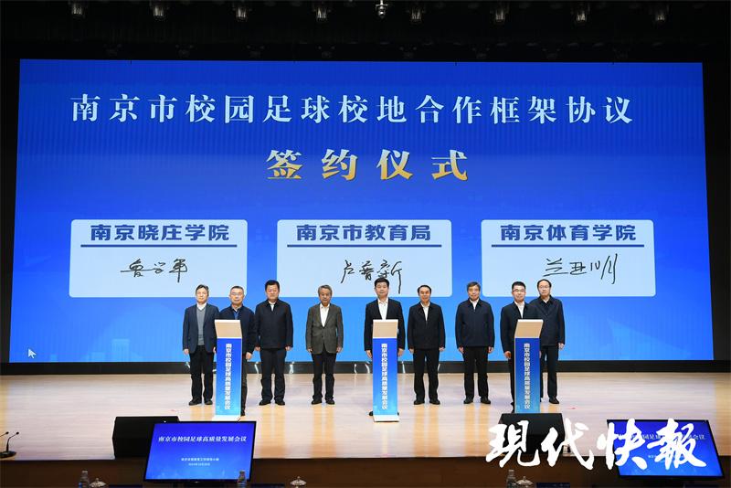 会议现场,南京市教育局还分别与南京体育学院、南京晓庄学院签署校园足球发展合作框架协议。今后,双方将在开展人才联合委托培养试点、建立师资培养与输送机制、搭建校园足球教科研平台、推动校地场馆设施资源共享、加强对外合作交流资源建设等方面加强合作,充分发挥高校、地方资源优势,助力南京校园足球高质量发展。
