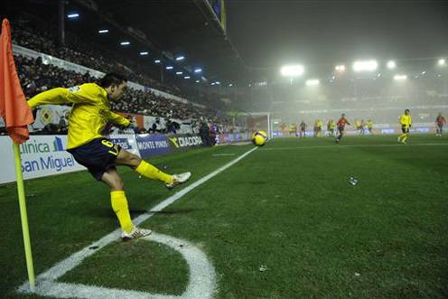 在离足球出界处较近的角球区内踢角球。角球可以直接射入对方球门而得分。