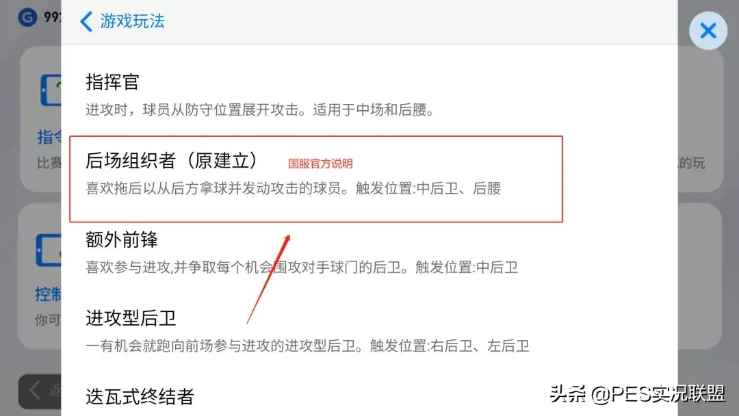 国服游戏说明中虽然赫然写着后场组织者风格的触发位置是中卫和后腰,但球员详细信息中显示的触发位置只有中卫,并且更为靠谱的外服说明中其触发位置也只有中卫,所以证明网易的官方说明有误。