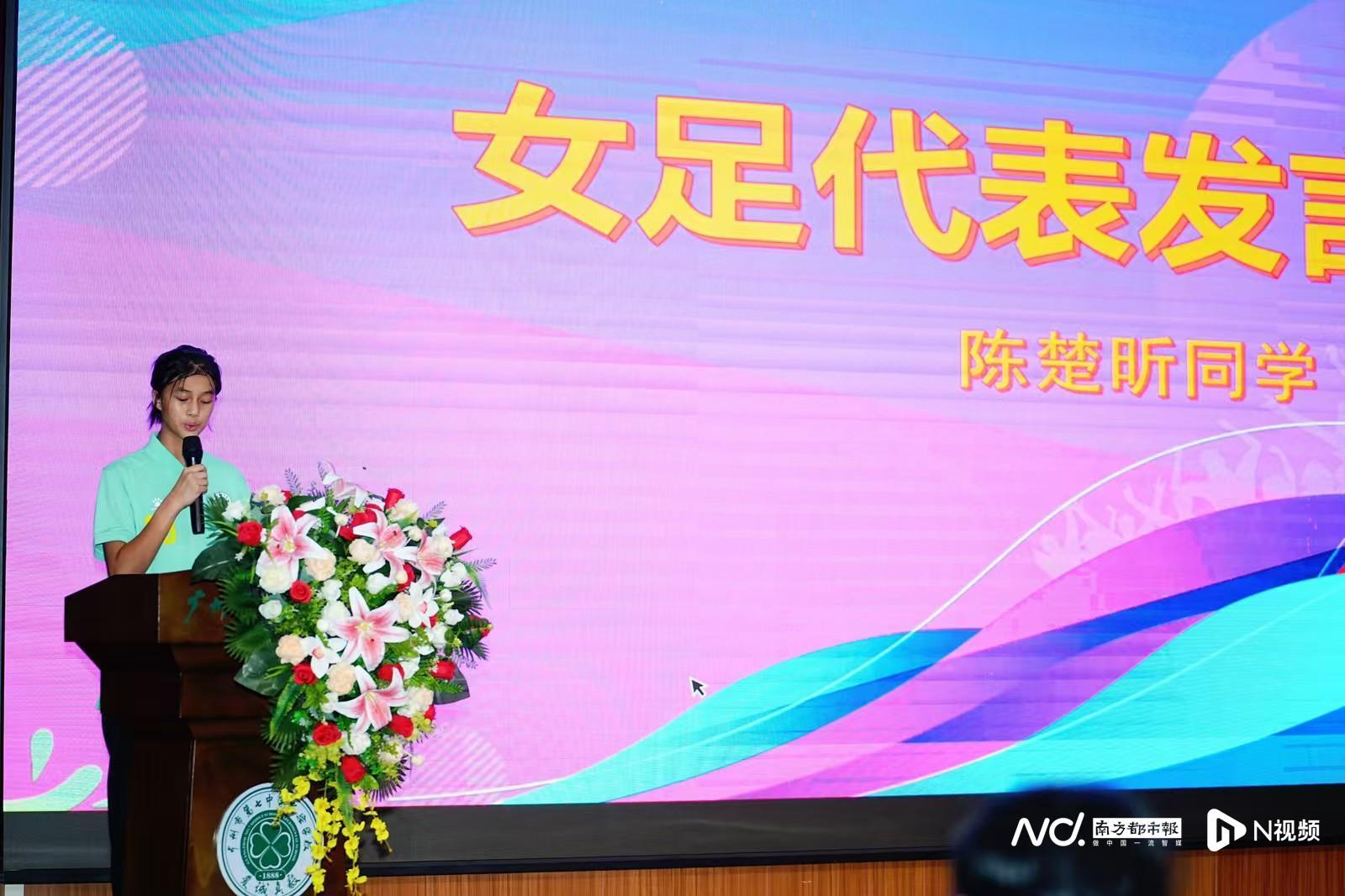 广州市第七中学实验学校党总支副书记、校长张献杰在致辞中介绍了广州市第七中学实验学校近年来积极探索通过体育运动推动学校全面发展的经验。他指出,作为“全国青少年校园足球特色学校”,足球是“七实”孩子们最喜爱的运动之一。学校坚持把女足建设作为学校的重点工作,作为落实立德树人、推进素质教育、引领学校体育改革创新的重要突破口,学校组建了不同年龄段的校级足球队,制定系统、科学的训练计划,常年开展课内课后足球训练,每年坚持开展校园足球联赛、校友杯足球赛、体育节等,学校平时校园足球的训练、比赛均由学生担任裁判工作,学生参与校园足球运动的人数超过80%,形成了“人人爱体育,班班有球队”的常态;采取“请进来,走出去”的方式,组织参加高水平的比赛,不断提高球队的技战术水平。