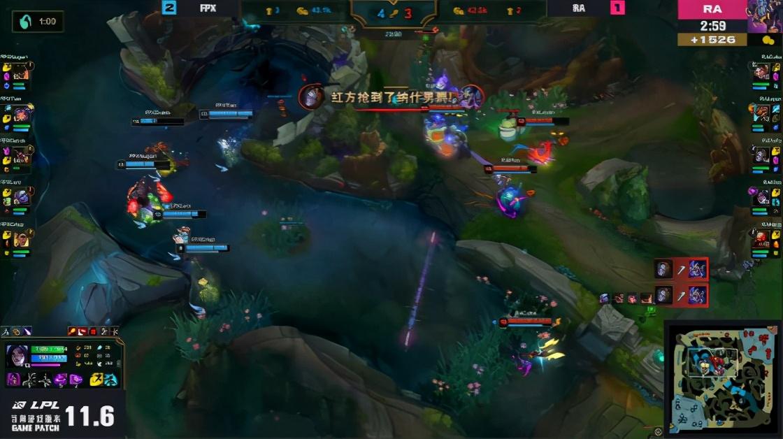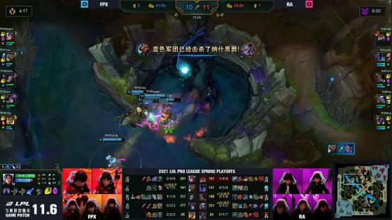 双方不断拉扯,围绕每一条小龙都进行了激烈争夺,注意调整了站位的FPX没有再给RA集火莎弥拉的机会,金克丝面临重重的突进威胁,甚至双招都没交就被FPX集火秒杀。30分钟左右FPX打出一波完美的团战0换5团灭了RA,随后拿下大龙Buff,将己方经济优势扩大到9千块以上。