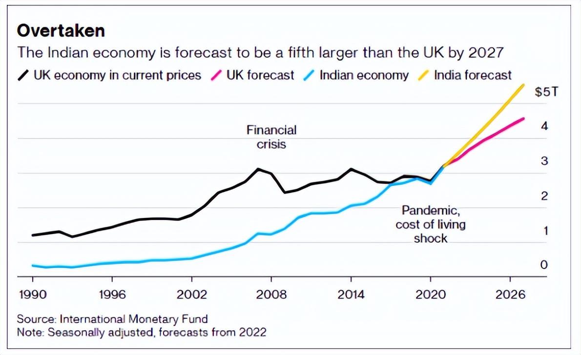 其实早在2019年的时候,印度的经济总量就已经微弱的优势超越了英国,只不过由于2020年的疫情,让英国再次反超了回来。到了2021年,印度再次超越了英国,并且一直保持到了今年,这一次,英国是没有机会追回来了。