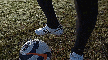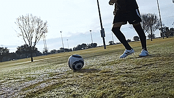 然后我们要击打球的正中间向下一点的位置,以确保能踢出回旋,直接击打中间同时也不会造成任何转向。