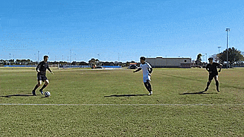 举个例子,在下面场景下,如果我们把球传到队友的右脚,那么我们就会给防守队员一个更好的机会去抢球,因为防守队员是从那边压迫的。