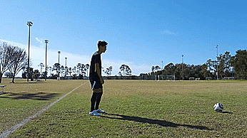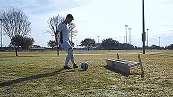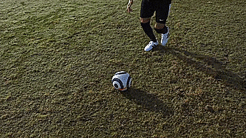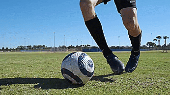 我们要用脚的最上面的部分击球,击打球的正中下方,如果我们打得太低,从下面切球,就会产生很多下旋,它会直接飞到空中。同样,我们的击球位置也不能太高,否则我们会把它踢到地面上,这样也没意义。