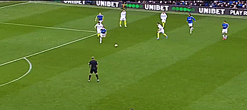 例如,下面场景,我们必须在队友越位之前把球踢出去,这样我们根本没有时间调整到脚内侧或者换脚。