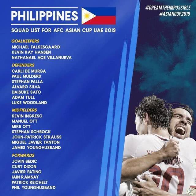 菲律宾是亚洲历史比较悠久的国家队之一,总是无缘大赛的他们在东南亚的“铃木杯”比赛中击败卫冕冠军越南,震惊东南亚。菲律宾足球的崛起主要靠规划大批有技战术的球员,中国球迷最熟悉的莫过于前建业外援哈维尔-帕蒂诺,另外还有来自切尔西青训的哈兹本德兄弟,不过队内的头号巨星,效力于加的夫城的国门埃瑟里奇则表示不会参加亚洲杯。
